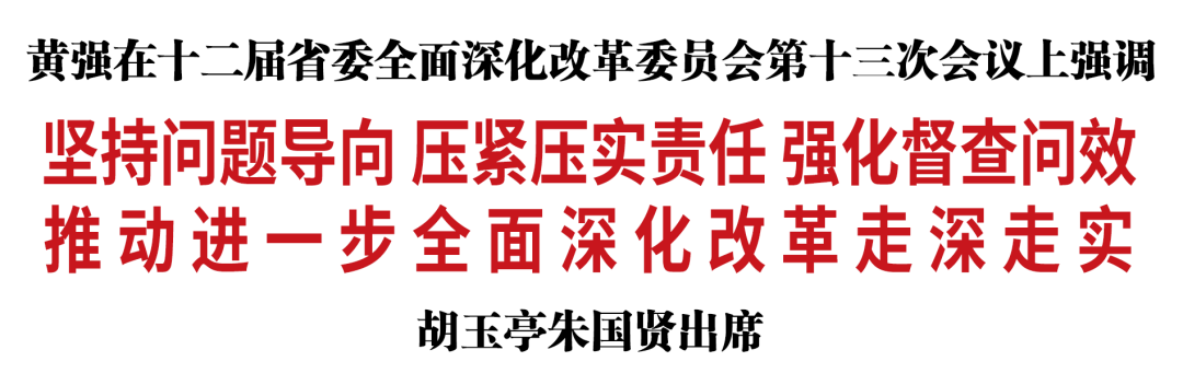 6月26日,省委書(shū)記、省委全面深化改革委員會(huì)主任黃強(qiáng)主持召開(kāi)十二屆省委全面深化改革委員會(huì)第十三次會(huì)議,利用一整天時(shí)間聽(tīng)取我省改革任務(wù)推進(jìn)落實(shí)情況。他強(qiáng)調(diào),要深入貫徹黨的二十屆三中全會(huì)精神,扎實(shí)推進(jìn)省委十二屆五次全會(huì)各項(xiàng)改革任務(wù)落實(shí),堅(jiān)持問(wèn)題導(dǎo)向,壓緊壓實(shí)責(zé)任,強(qiáng)化督查問(wèn)效,推動(dòng)進(jìn)一步全面深化改革走深走實(shí)。省長(zhǎng)、省委全面深化改革委員會(huì)副主任胡玉亭出席會(huì)議并提出工作要求。省政協(xié)黨組書(shū)記、主席朱國(guó)賢出席。
