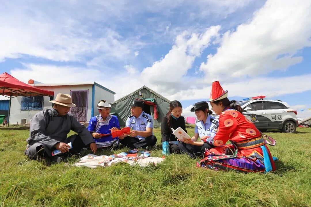 2025年8月13日,甘肅張掖肅南裕固族自治縣皇城鎮(zhèn)司法所工作人員深入夏日塔拉草原,為牧民群眾開(kāi)展普法宣講活動(dòng)。來(lái)源:視覺(jué)中國(guó)