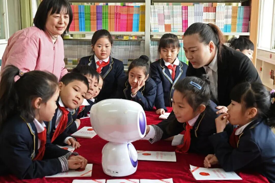 河南漯河源匯區(qū)司法局工作人員在課堂上操作普法機(jī)器人和孩子們互動(dòng)學(xué)法。來(lái)源:視覺(jué)中國(guó)